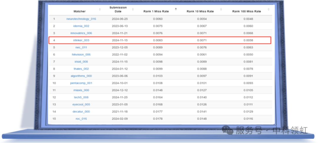 国际顶尖机构标准与技术研究院(NIST)主办的IREX10虹膜识别算法挑战赛(IREX 10: Ongoing Evaluation of Iris Recognition)是全球最权威的虹膜识别算法评估项目之一,在Rank 1 精度中,中科领虹(irLinker)团队取得了全球排名第四,国内第一的优异成绩,再次彰显了中科领虹在人工智能和生物特征识别领域的领先地位。