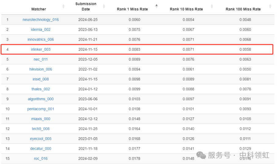 近日,由国际顶尖机构标准与技术研究院(NIST)主办的IREX10虹膜识别算法挑战赛(IREX 10: Ongoing Evaluation of Iris Recognition)公布了最新比赛结果。来自中科领虹(irLinker)团队在激烈的全球竞争中脱颖而出,凭借卓越的技术实力和创新算法,在Rank 1 精度中,中科领虹(irLinker)团队取得了全球排名第四,国内第一的优异成绩,再次彰显了中国在人工智能和生物特征识别领域的领先地位。